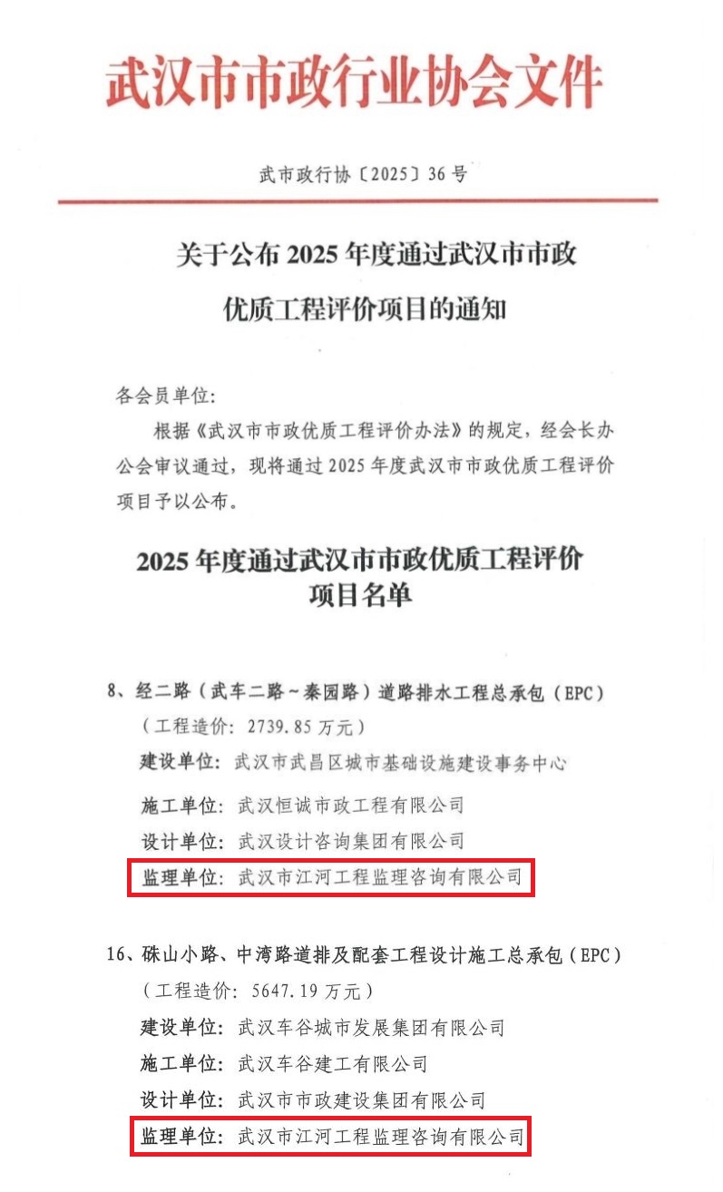 近日,武汉市市政行业协会公布了2025年度武汉市市政工程优质奖评选结果,江河监理公司承监的多项工程脱颖而出,成功斩获两项金奖和三项银奖,以卓越表现彰显了公司在监理行业的雄厚实力与品牌担当。